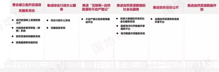 国地科技在深入解读《总体方案》的基础上,将其建设要点概括为“一个基础,两个支撑,三类应用体系,四大目标和五大保障体系”,即以自然资源“一张网”为基础,形成自然资源“一张图”和国土空间基础信息平台两个支撑,构建自然资源监测评价、自然资源监管决策和互联网+自然资源政务服务三大应用体系,实现横纵联通基础支撑、三维动态监测与感知、全过程综合监管、“一网通办”政务服务四大建设目标,同时推出信息技术应用创新和安全机制、信息化标准规范体系、信息化经费投入机制、信息化管理制度和引入社会服务机制五大保障措施,形成多级联动、业务协同、精准治理的自然资源管理新模式,不断提升自然资源治理的能力和现代化水平。